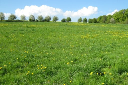 Illustration: The photo shows from a hill down a green landscape of meadows, small forests and some buildings in between. In the background yellow rape fields can be seen.