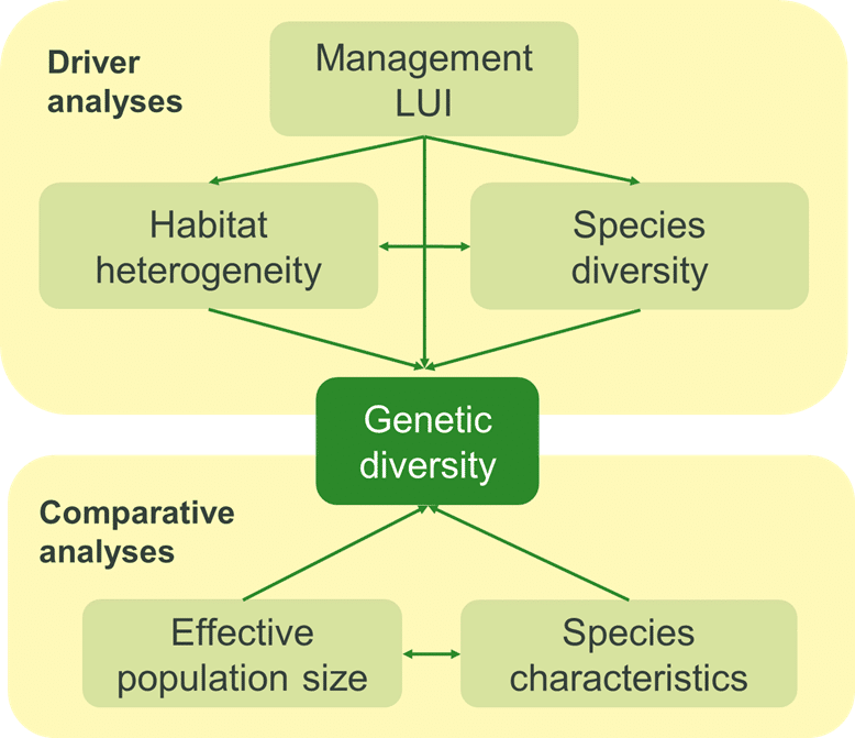 - Hypothesis 3 | Genetic diversity is higher in plots with greater environmental heterogeneity and lower management intensity, both for individual species and at the across-species level.